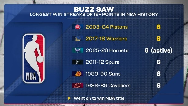 据统计,黄蜂过去19场比赛赢下其中16场,目前已经连续6场至少赢下15分,自2017-18赛季勇士以来最长,也是并列历史第二长,最长为8连胜(2003-04赛季活塞)。